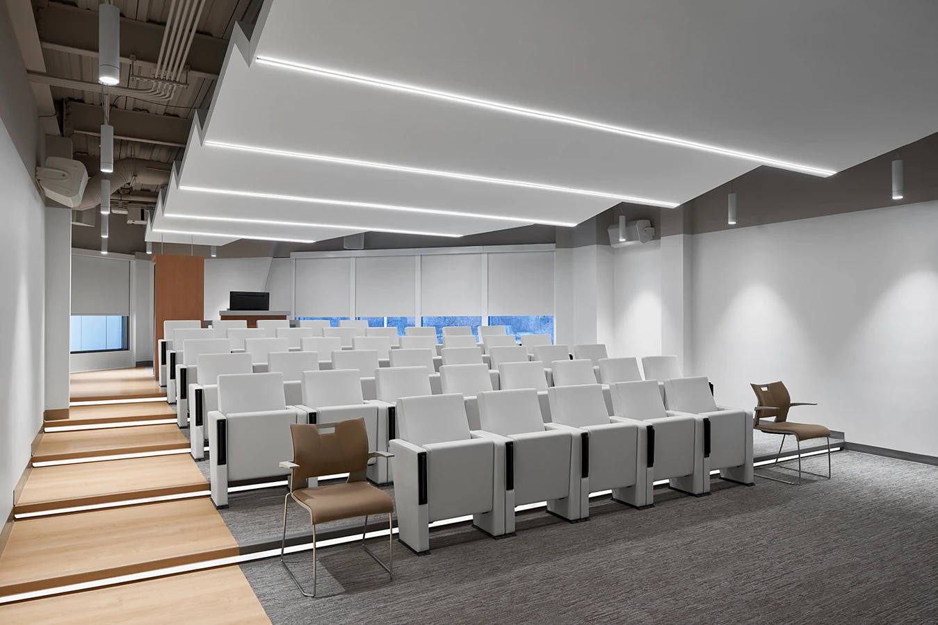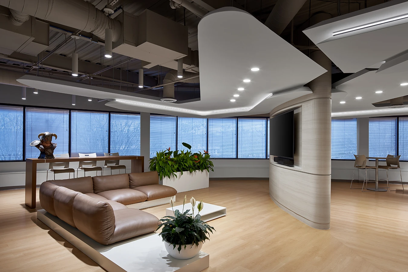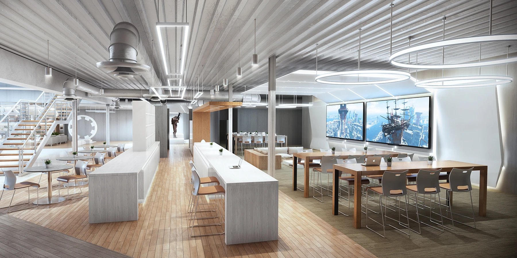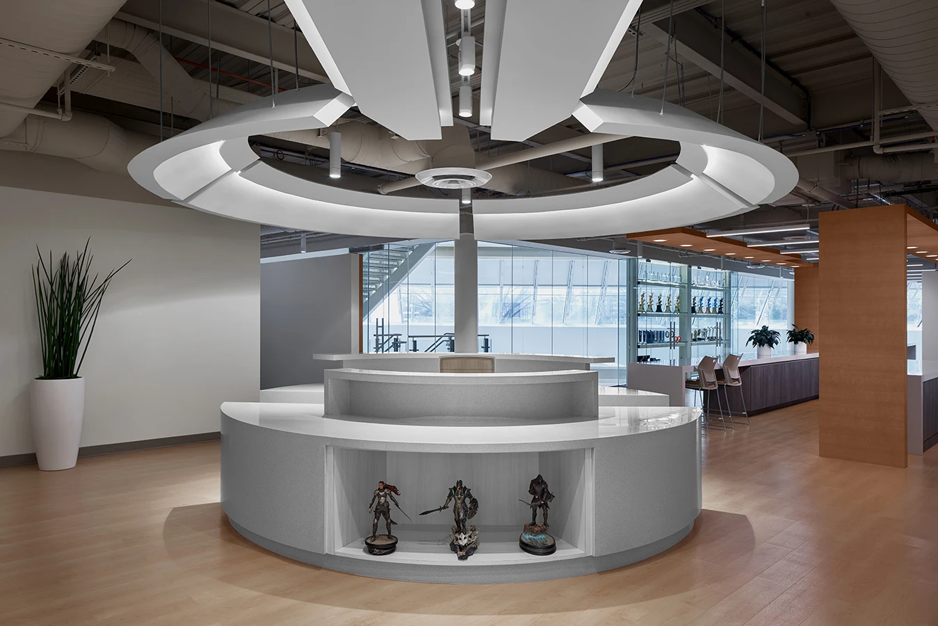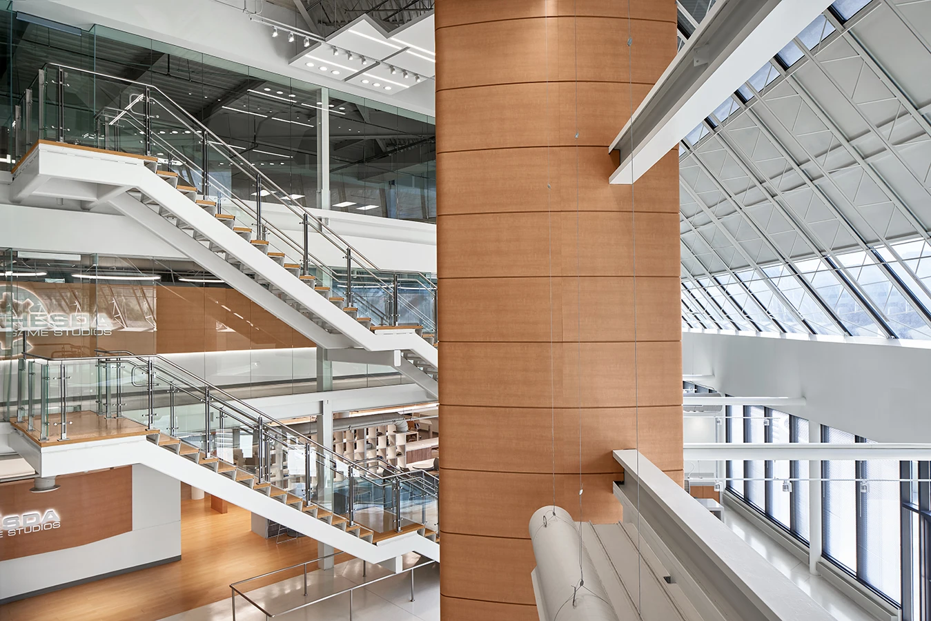 Advanced media technology and displays, abundant connectivity in cabling and power requirements, come together in a complex environment of layered technology. Collaborative spaces, game lounges and conference rooms bring together creative teams working in-house and in connected studios. Within a lively interplay of natural light, curving forms, and natural color palettes, creatives engage.